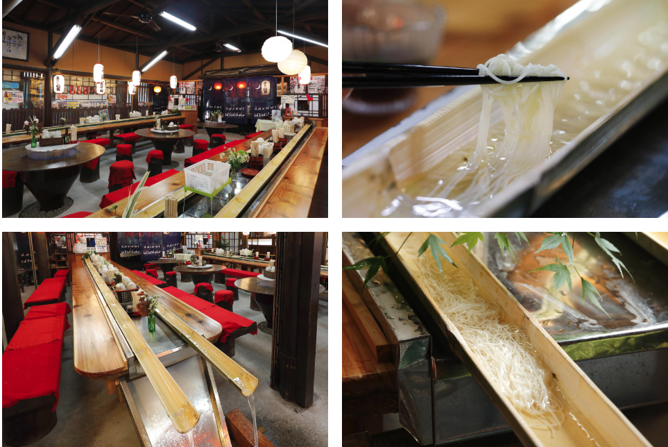 At Chihonoie, visitors can experience the unique dining style of placing somen noodles into flowing water and quickly catching them to taste.