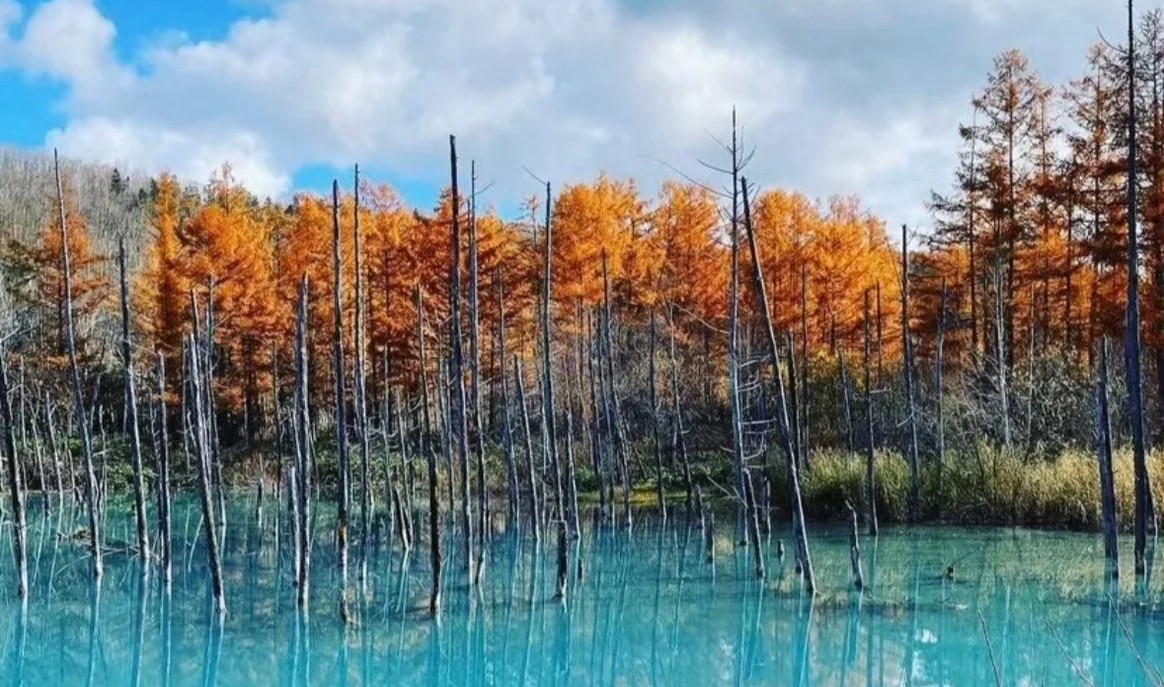 北海道賞楓|美瑛青池:鈷藍池水澄如鏡,枯木剪影靜立其中,火紅楓葉倒映其上;晨霧輕籠、夕陽斜照,整座青池化作夢幻畫布。