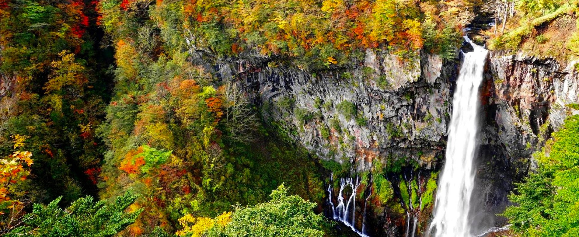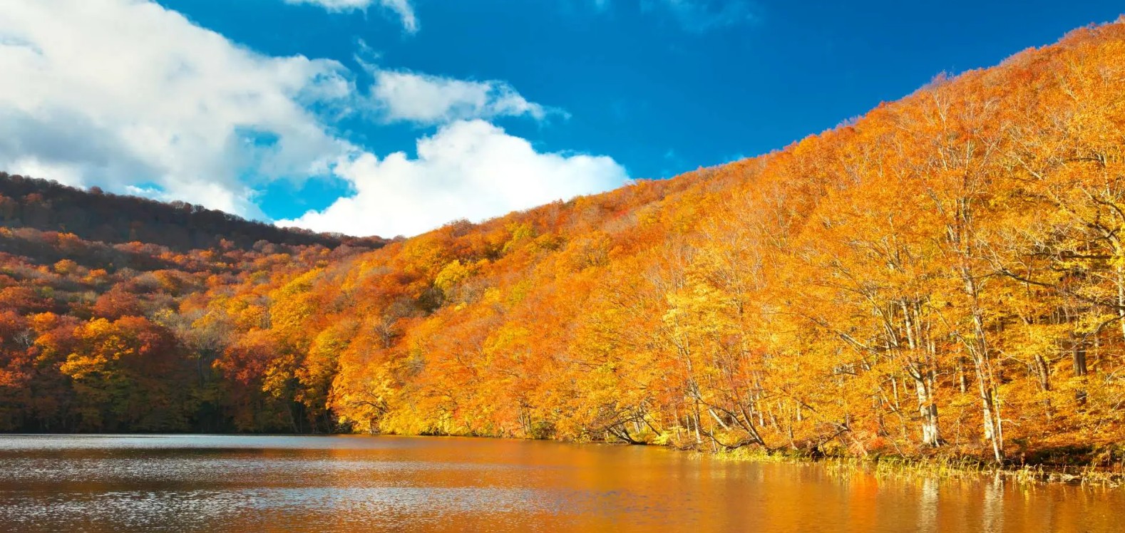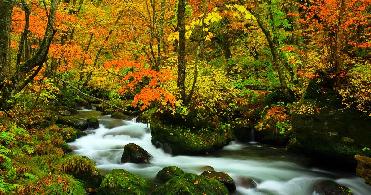 青森賞楓|奧入瀨溪流:十餘公里溪谷被赤橙金楓包圍,瀑布、水瀑與苔石相映成趣;陽光穿過樹冠灑出琥珀光芒,將整條溪谷染成流動的紅葉長廊。