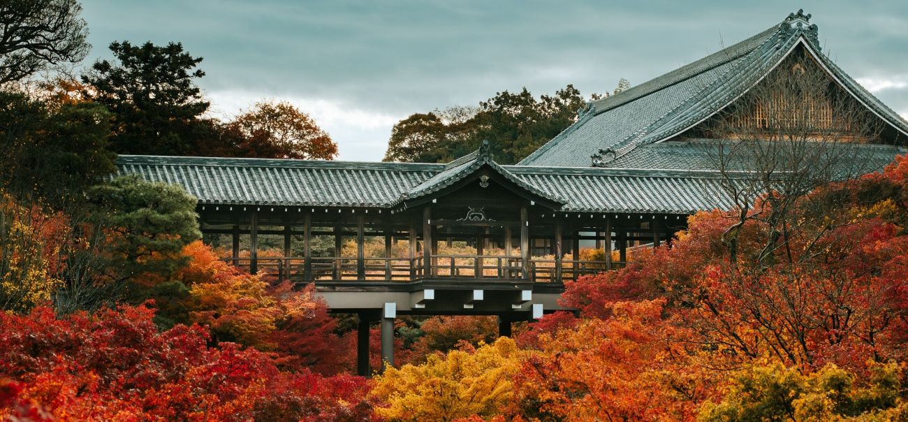 京都賞楓|東福寺:通天橋俯瞰洗玉澗,兩千餘株楓海由金轉紅,層層疊疊宛如雲瀑奔流;晨光斜灑,方丈四庭的白砂與苔綠映出光影禪趣。