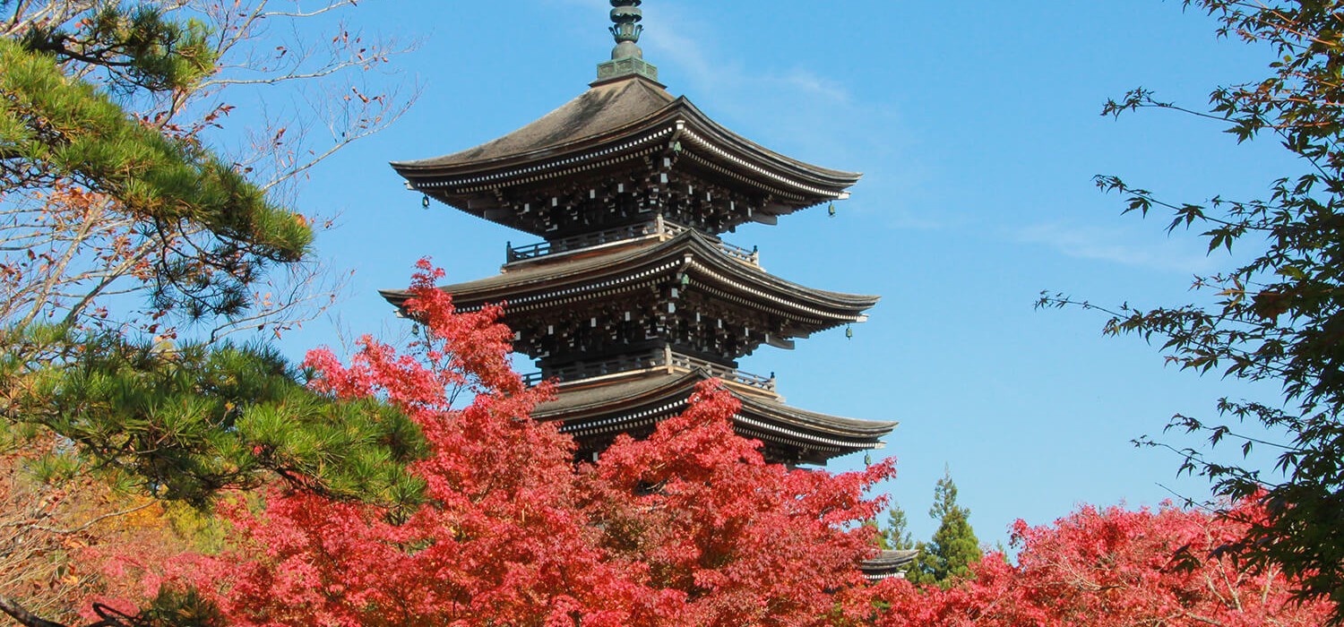 仙台賞楓|定義如來西方寺:紅黃楓葉環抱五重塔與古銀杏,朱橋映在微波水面,秋色如燃。漫步定義如來西方寺,彷彿置身禪境畫卷。
