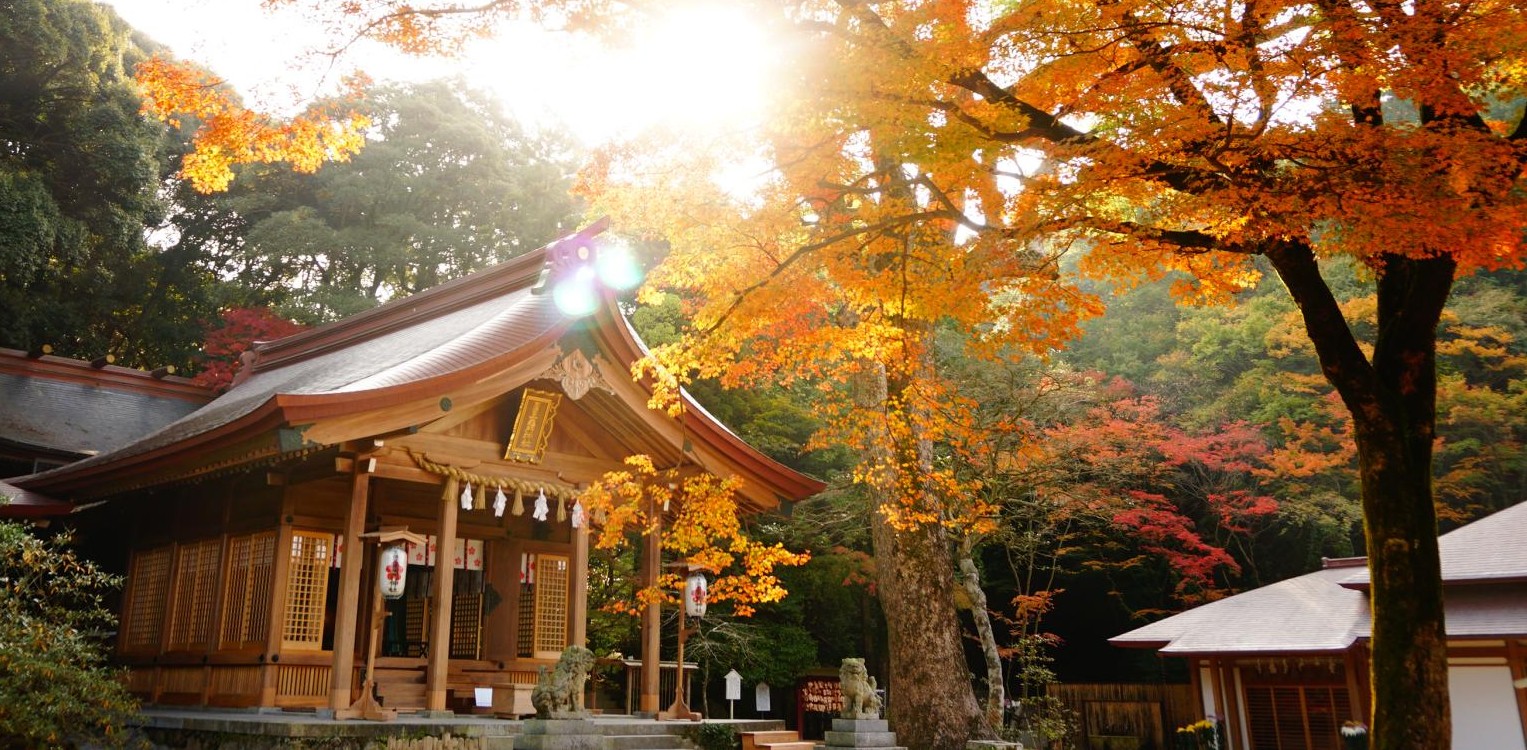 福岡賞楓|寶滿宮竈門神社:寶滿宮竈門神社楓紅滿山,朱鳥居沿石階穿越楓林直通御本殿,戀守點燈在夜晚映出浪漫光影。