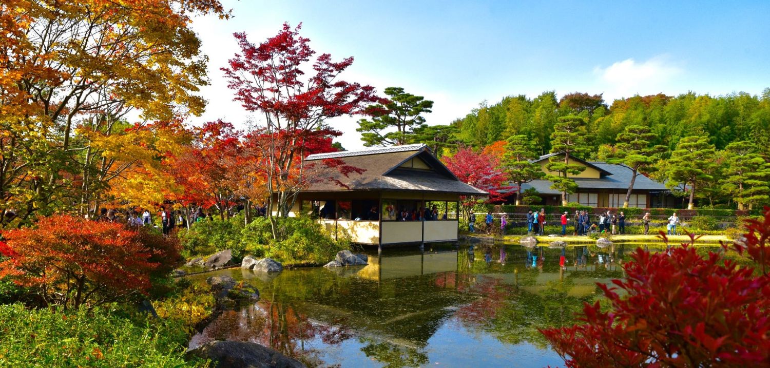 名古屋賞楓|德川園:德川園日式庭園楓紅如畫,映池倒影襯茶屋古橋,幽靜秋景詩意盎然。