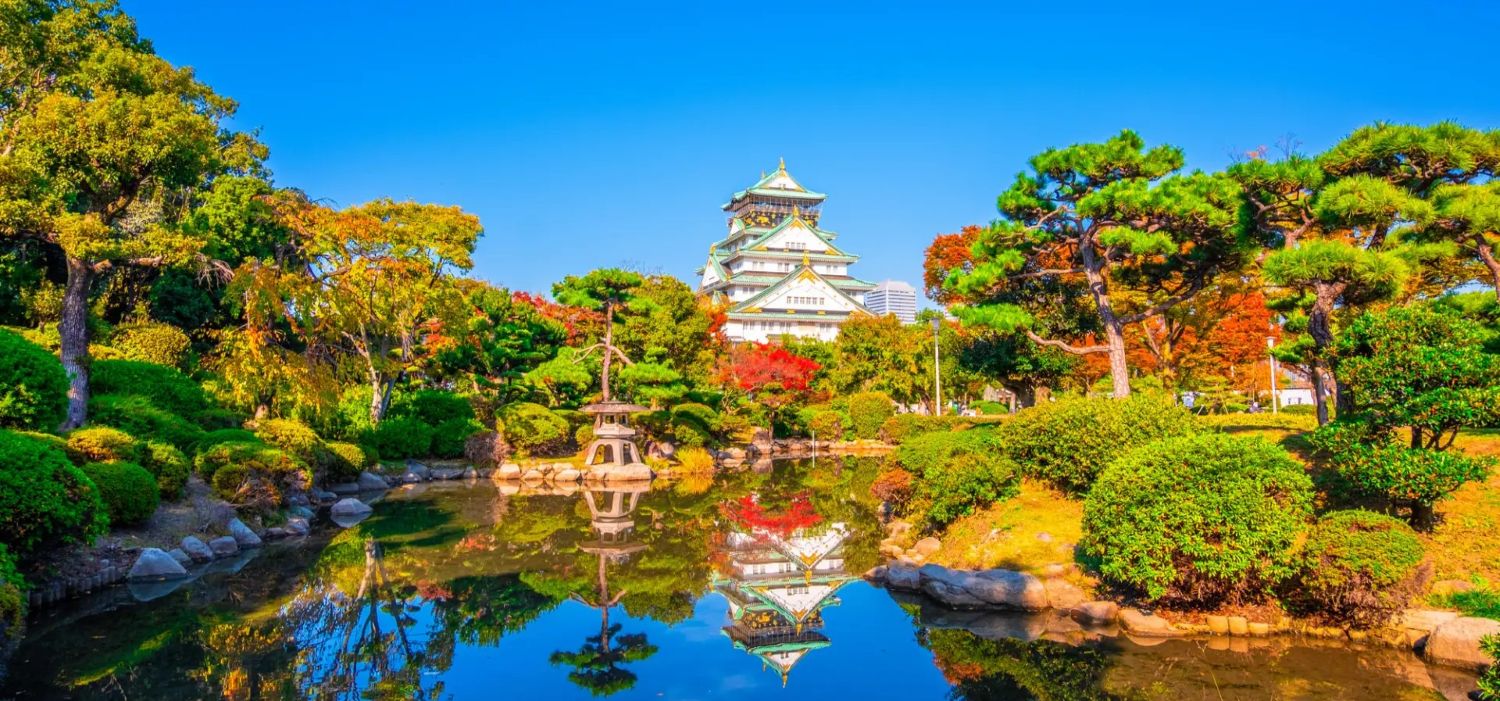 大阪賞楓|大阪城公園:大阪城公園楓紅環繞天守閣,紅葉與石牆共映壯麗秋景,晨昏皆宜散步賞楓。