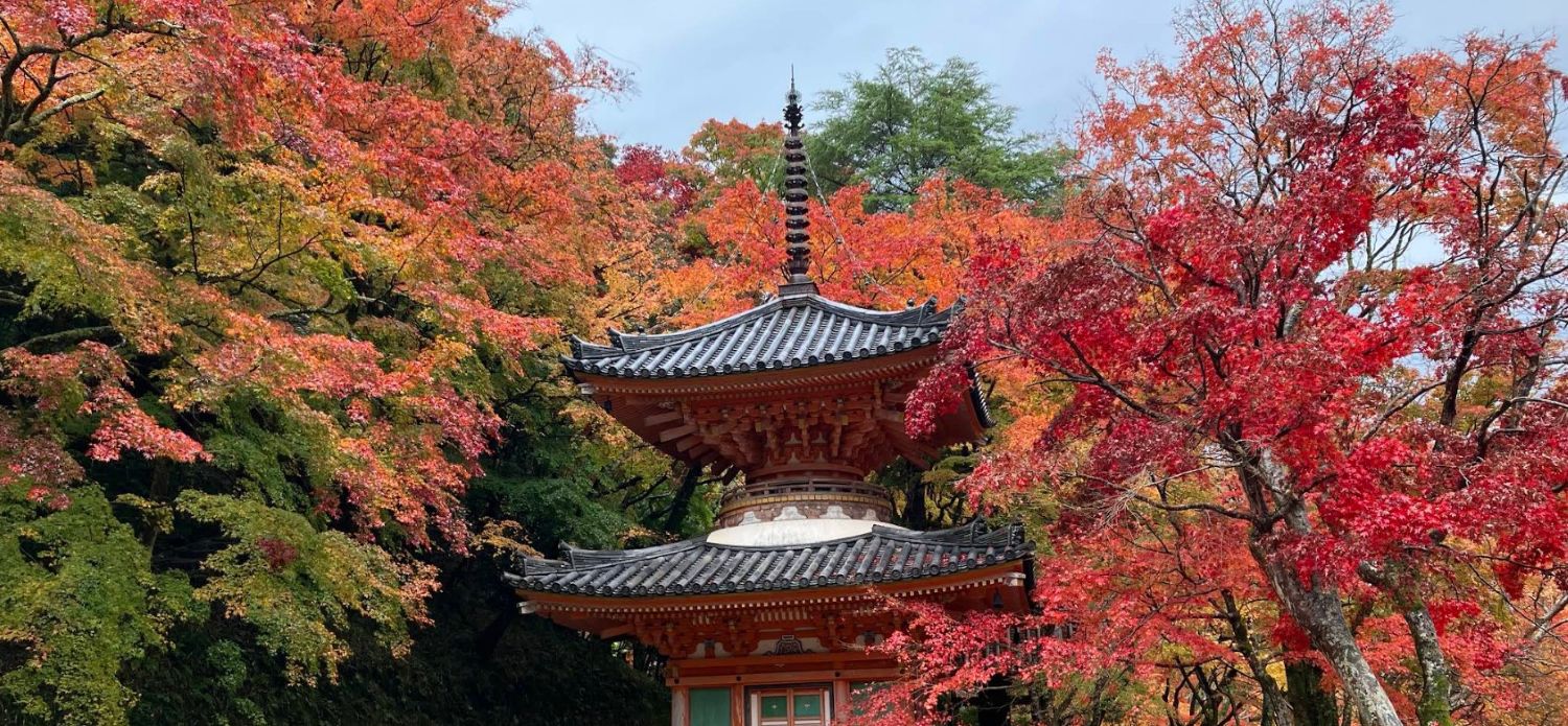 大阪賞楓|大威德寺:隱身天野山間,千株楓樹環抱古剎,紅葉如火瀑自山坡傾瀉而下。秋日晨霧籠罩山谷,石階步道間楓影斑斕,清幽中透著莊嚴禪意。