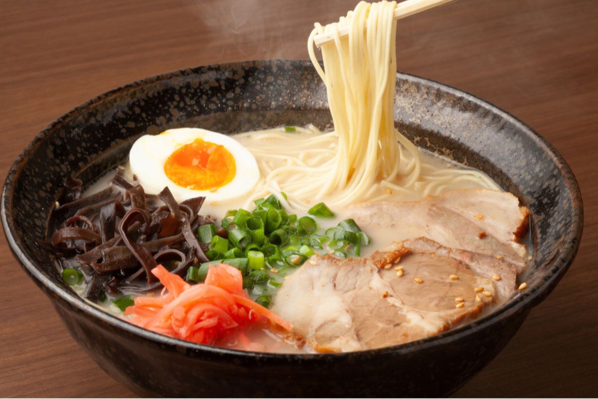 A signature dish of Kyushu, featuring rich pork bone broth with thin straight noodles. Famous chains include Ichiran, Ippudo, and Nagahama-ya.