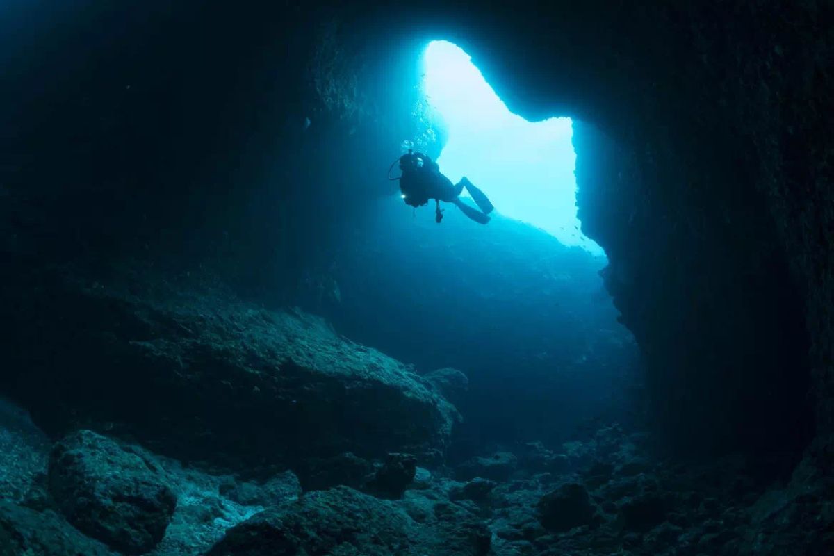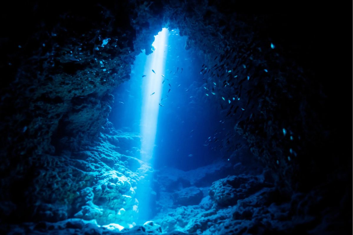 A dark, castle-like cave system lit by sunbeams through ceiling holes—mystical and breathtaking. Due to its complex structure, this site is best for advanced divers.