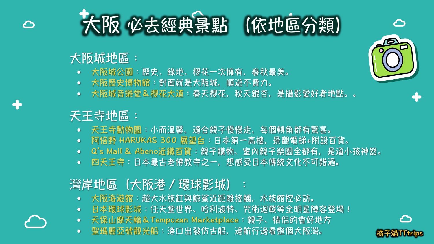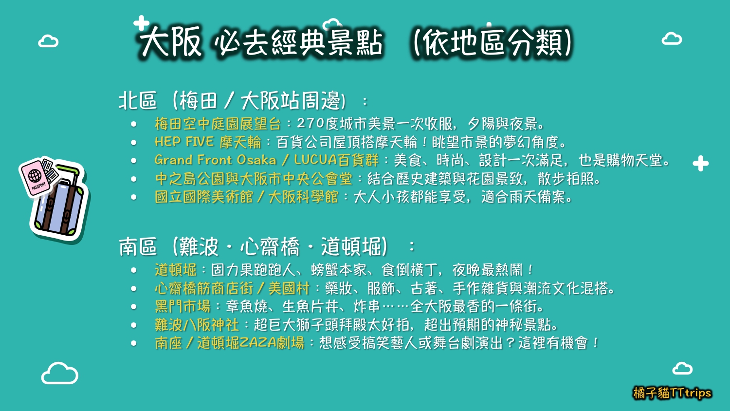 *如果你只有一天時間 > 建議集中「南區」和「大阪城」行程,搭配逛街+文化賞析剛剛好。