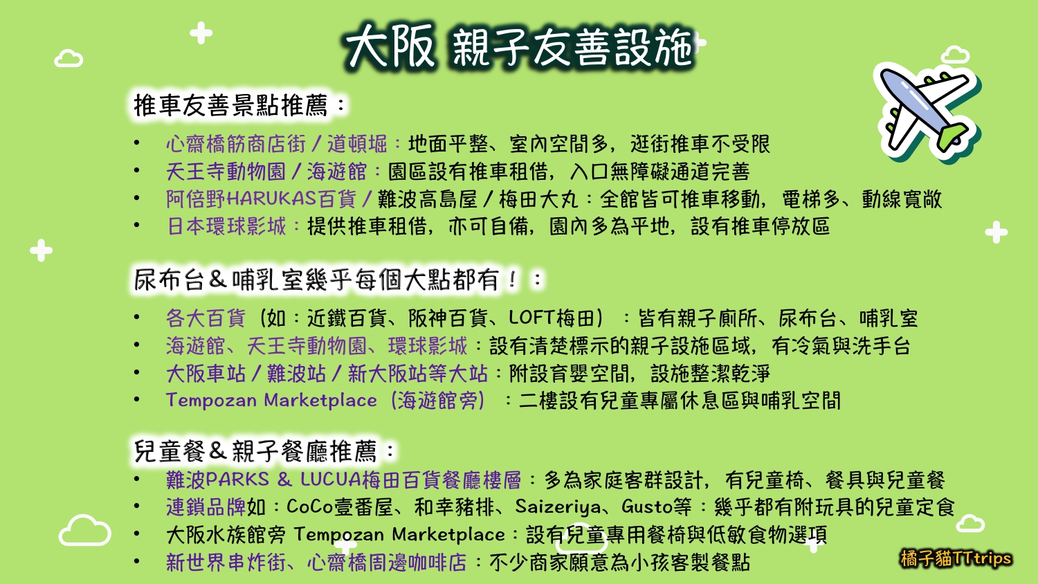 根據大阪觀光局及多家景點/百貨公司官網資訊(如環球影城、Tempozan Marketplace、各大百貨集團),大阪的親子設施完善度高到讓你想搬過去住!電梯、哺乳室、尿布台、兒童椅、推車租借,該有的全都有,還貼心到細節。以下就幫爸媽們一口氣整理好最實用的「大阪親子設施重點筆記」,旅程省心、孩子開心,爸媽也不必搞得像參加鐵人三項!