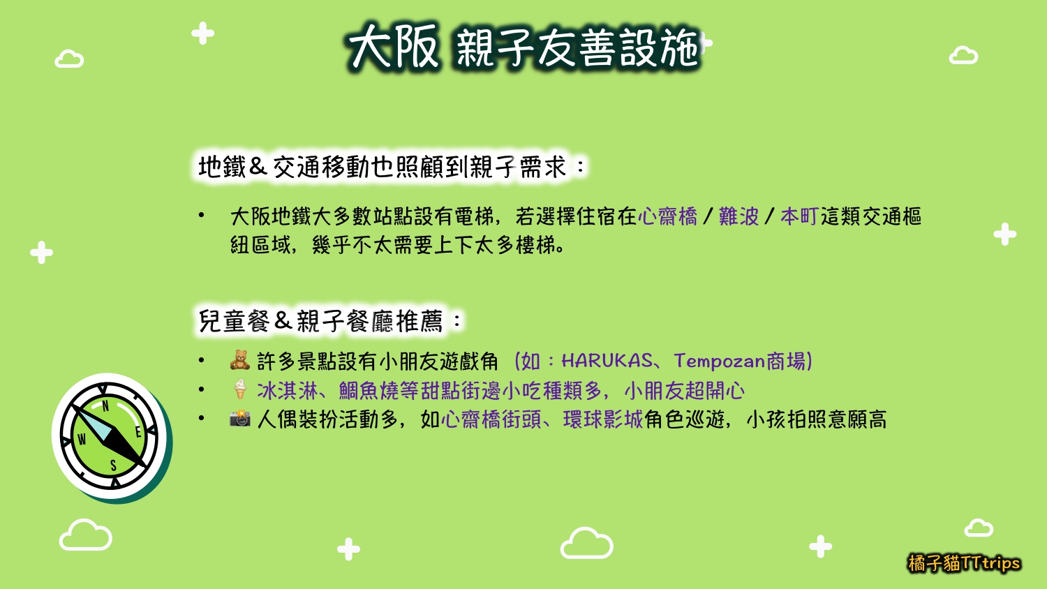 *帶小孩的話 建議住「天王寺」或「灣岸地區」,動物園與海遊館行程可輕鬆安排。