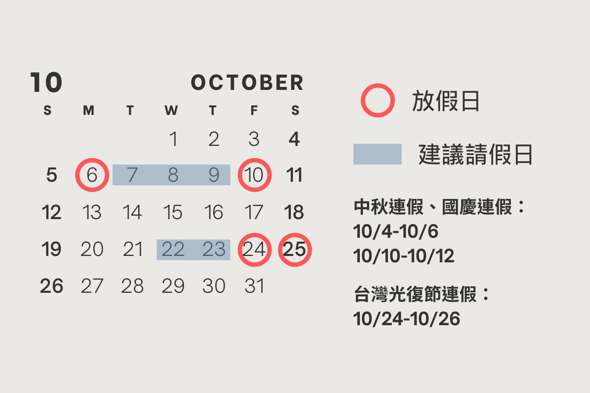 連休時間:10/4(六)~10/8(三)共 5 天!