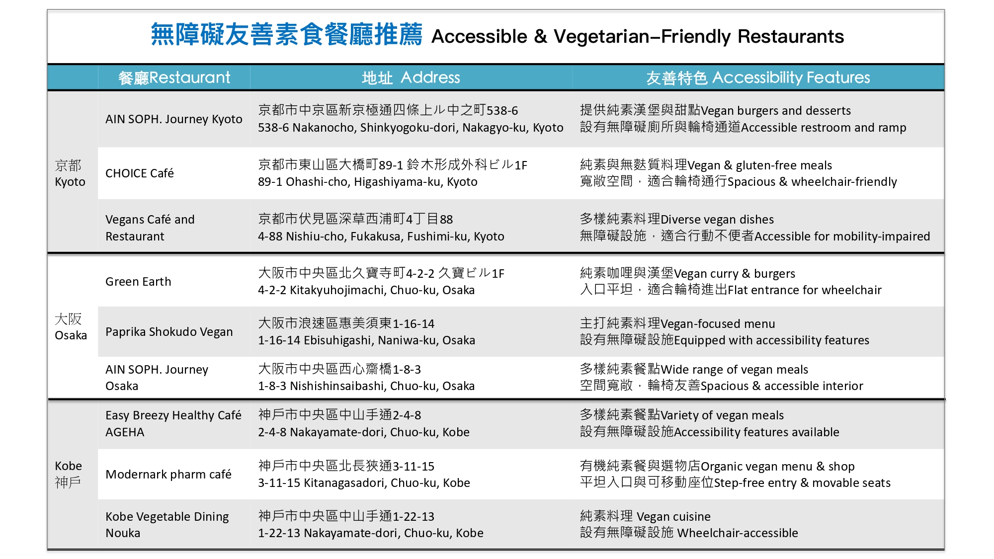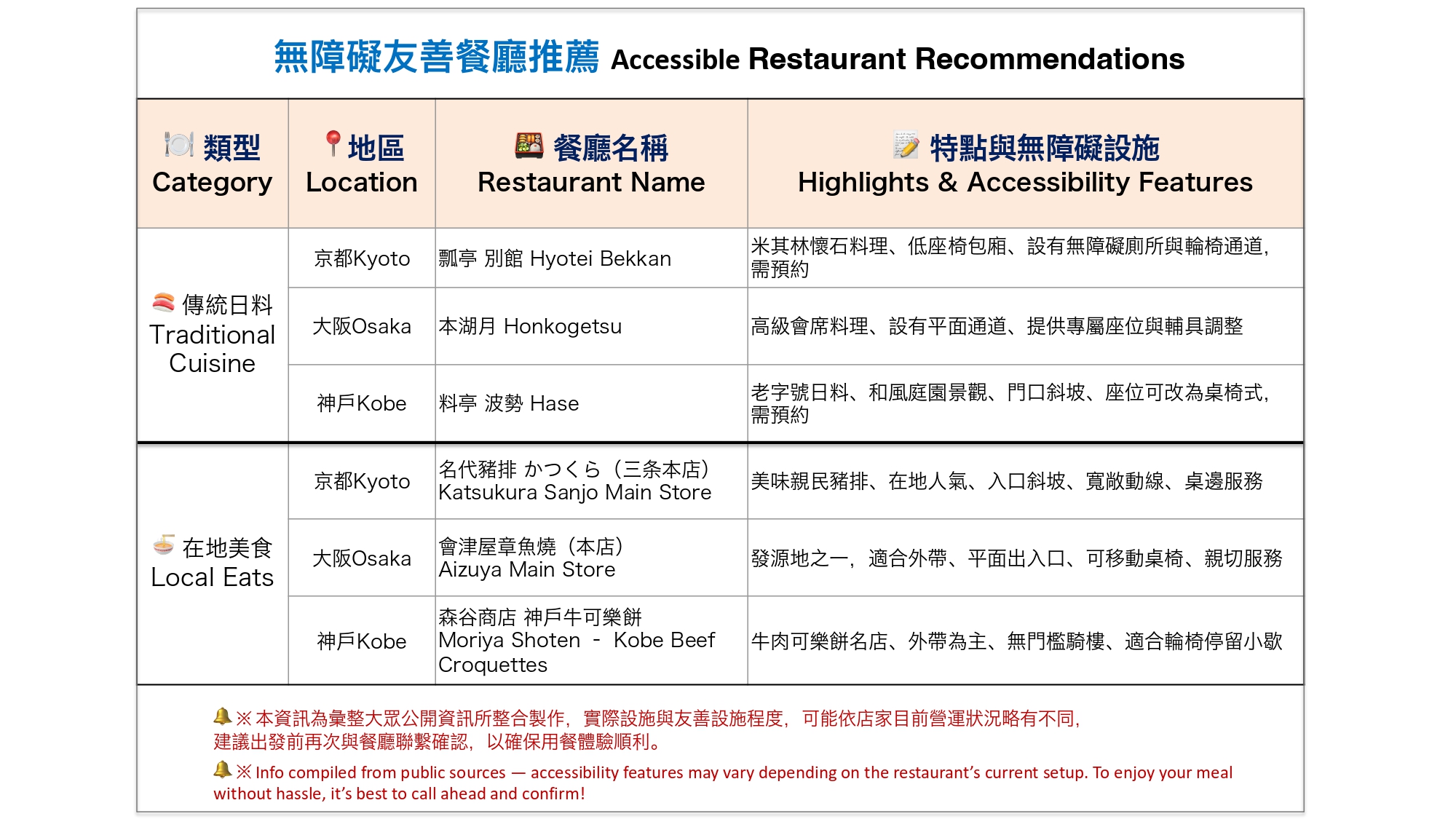 •    三宮地區:主要街道平坦,適合輪椅通行,部分店家提供筆談服務與低檯點餐窗口。