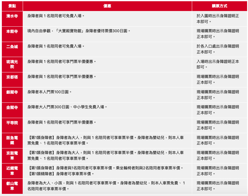 2024年版-京都身障者設施門票優惠: